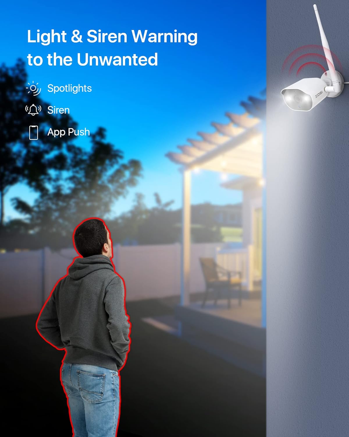 - 5 MP Super HD & Night Vision & IP66 Rezistent la intemperii: Camera Super HD de 5 MP vă poate oferi videoclipuri și imagini clare, cele 4 lumini albe acceptă opțional vederea pe timp de noapte color. Viziunea de noapte de 30 de picioare vă permite să vedeți fețele sau plăcuțele de înmatriculare pe timp de noapte. Cu impermeabilitate IP66, camerele funcționează chiar și în medii dure, cu ploaie și praf.