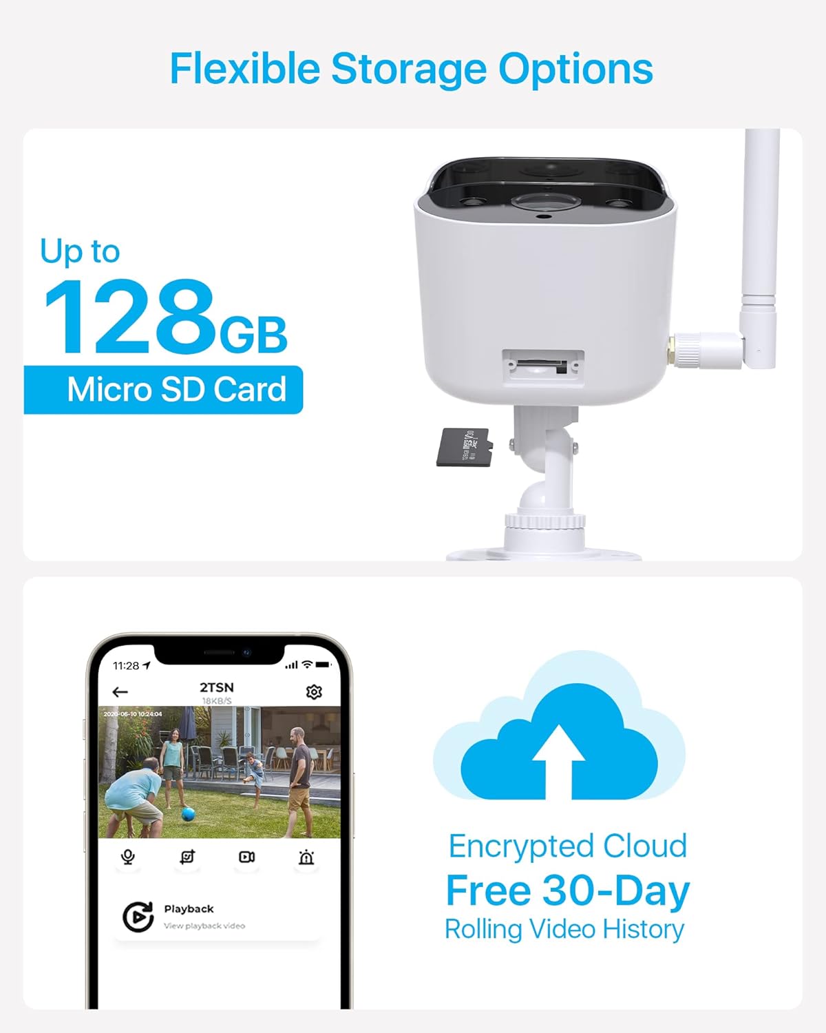- Conexiune ușoară, stocare locală și în cloud: conectați până la 8 camere la o stație de bază (acest set conține 2 camere). Puteți citi oricând și oriunde cu stocare locală sau stocare în cloud. Camerele acceptă card Micro SD de până la 128 GB pentru stocare locală (cardul SD nu este inclus), 30 de zile de stocare gratuită de testare în cloud pentru un cont nou.